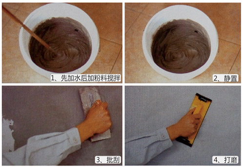 施工 | 先在容器中加入清水,按比例加入膩?zhàn)臃哿?;使用電?dòng)攪拌機(jī)攪拌,混合比例﹙粉料:水﹦25:8.5﹚;充分?jǐn)嚢?-10分鐘至均勻,沒有顆粒,靜置3-5分鐘,再攪拌一次即可使用;通常膩?zhàn)优谓ㄗh采用抹刀進(jìn)行施工,已獲得細(xì)膩平整的表面 |